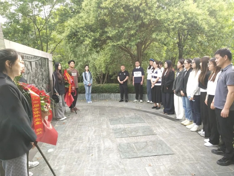 毕业生代表姚瑶、马欣然以及入党积极分子代表刘永悦、刘通心怀敬意,向这片承载着华中鲁艺抗战精神的圣地敬献花篮,以此表达对鲁艺先辈们的深切缅怀和对鲁艺精神的崇高敬意。