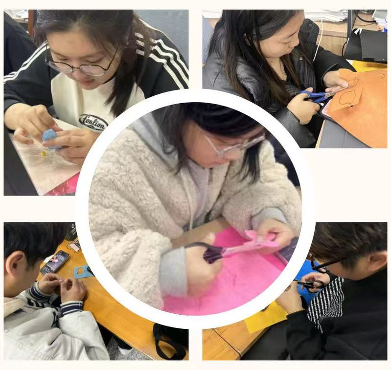 活动现场,彩色不织布、手工材料包等工具一应俱全。同学们围坐在一起,通过观看教程学习不织布的裁剪技巧和缝纫方法,互相交流手工制作的技巧经验。在轻松愉悦的氛围下,同学们纷纷动手尝试,将一块块普通方正的不织布变成了形态各异、富有创意的手工艺品,如栩栩如生的小动物玩偶、色彩斑斓的钥匙扣等。一位参与活动的学生分享道:“这次活动让我深刻体会到了生活中的细腻与温馨。在制作的过程中,我感受到了一种放松,仿佛近日累积的小压力都得到了释放,内心充满了简单的快乐与满足感。”